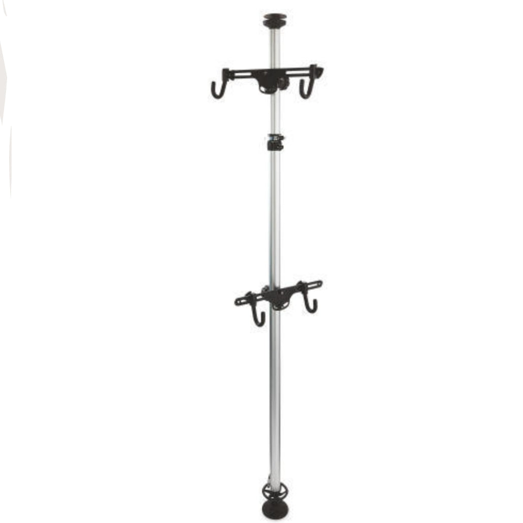 This ‘floor-to-ceiling’ bike stand design can securely hold two bikes anywhere within a room, without the need for any permanent fixings.
